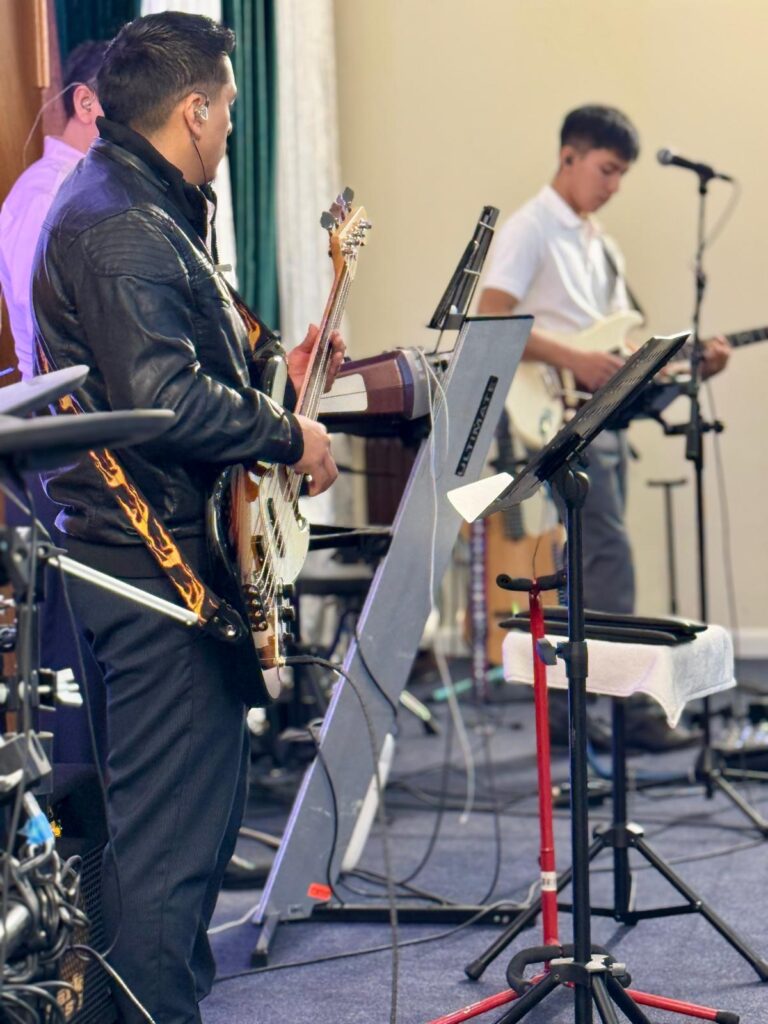 Músicos y vocalistas que guían a la congregación en la alabanza, creando un ambiente de adoración sincera y consagrada.